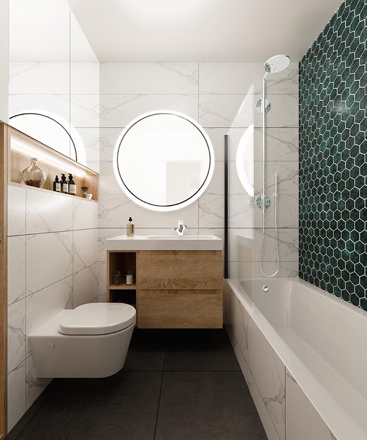- Kolorystyka, lustra i oświetlenie, które wpływają na odbiór przestrzeni i pomagają optycznie powiększyć łazienkę.
