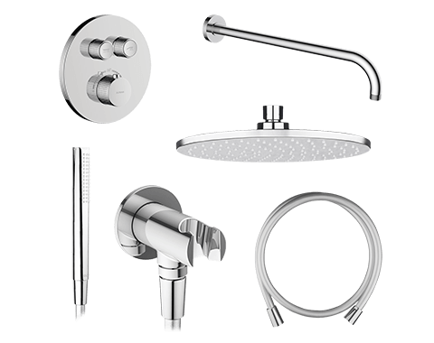 | W zestawie: | bateria z przełącznikiem, deszczownica, słuchawka prysznicowa, wąż prysznicowy, ramię natrysku, przyłącze kątowe |