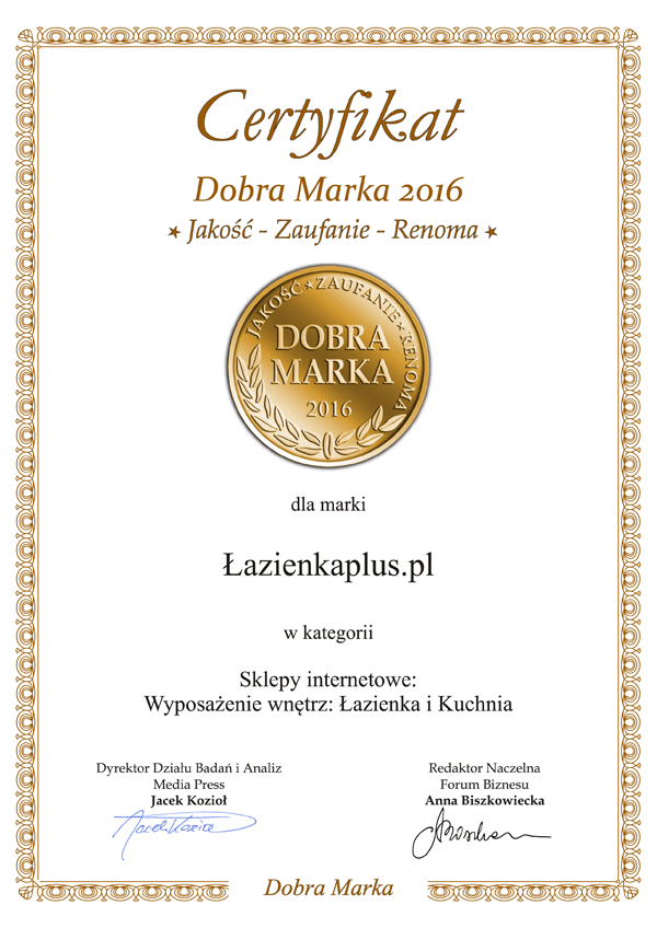 Sklep Łazienkaplus.pl otrzymał wyróżnienie „Dobra Marka 2016” w kategorii Sklepy internetowe: wyposażenie wnętrz Łazienka i Kuchnia, tym samym uzyskując tytuł lidera w swojej branży.