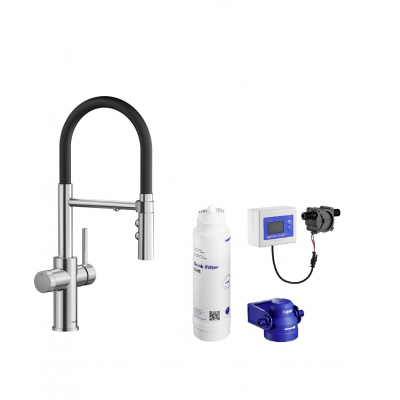 Opis zestawu Blanco Catris-S bateria kuchenna stojąca czarny mat/stal z zestawem filtrującym wodę (526706, 527453)