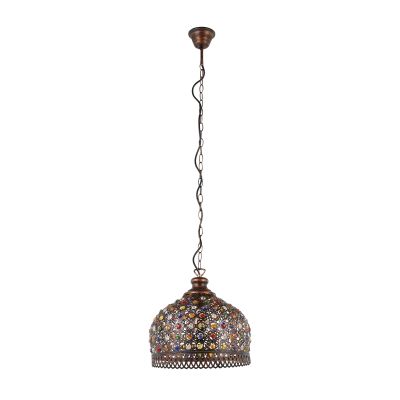 Lampa wisząca JADIDA ma okrągły klosz wykonany z metalu w kolorze antycznej miedzi z zakrzywionymi wycięciami tworzącymi etniczny wzór. Klosz został połączony z kolorowymi szklanymi kamieniami i łańcuszkiem z ogniwami, które umiejętnie dopełniają wyjątkowy wygląd lampy. Wycięcia i ozdobne kamienie tworzą fascynującą grę światła i koloru, gdy tylko lampa jest włączona. Lampa wisząca idealnie wpisuje się w trendy takie jak vintage, oriental czy boho, przenosząc urok dalekich krain do własnego domu. Oferuje nastrojowe oświetlenie do każdego pomieszczenia - czy to w salonie, czy też w jadalni nad stołem jadalnym. Przedstawiona żarówka nie jest objęta zakresem dostawy. Do lampy pasują żarówki z trzonkiem E27.