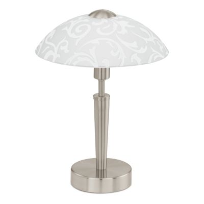 Lampa stołowa SOLO składa się z metalowej podstawy w kolorze matowego niklu i okrągłego klosza z matowego szkła z nadrukowanymi, zakrzywionymi elementami dekoracyjnymi w kolorze białym. Dzięki prostej konstrukcji lampa stołowa pasuje do niemal każdego wnętrza i można ją łatwo włączać i wyłączać, dotykając obszaru „Dotknij mnie” znajdującego się na podstawie lampy. Lampka oferuje nowoczesne oświetlenie do każdego pomieszczenia - czy to w sypialni na szafce nocnej, w salonie czy przedpokoju. Żarówka nie wchodzi w zakres dostawy.