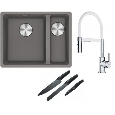 Franke Maris MRG 160-34-15SBR zlewozmywak 52x40 cm Fragranite kamienny szary z baterią kuchenną Lina chrom/biały (1250687266, 1150626088)