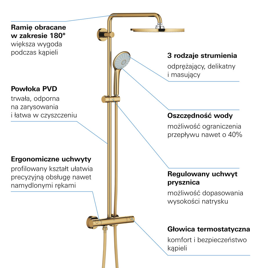 System rozprowadzania wody wewnątrz głowicy pryszniców GROHE sprawia, że w każdej dyszy utrzymane jest równe ciśnienie. Bezpośrednio przekłada się to na komfort odczuwalny podczas kąpieli, a strumień natrysku pozostanie równy nawet wtedy, gdy ustawisz słuchawkę pod kątem.