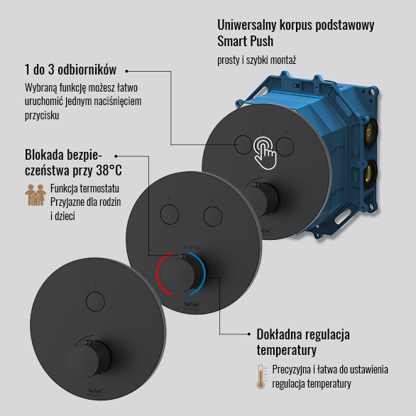 Wyobraź sobie łazienkę, w której jednym, prostym dotknięciem przycisku rozpoczynasz swój osobisty rytuał relaksu. Seria Smart Push zamienia codzienny prysznic w wyjątkowe doznanie – intuicyjne, bezpieczne i idealnie dopasowane do Ciebie.