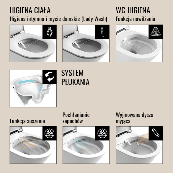 Perfekcyjna higiena i świeżość. Delikatne mycie ciepłą wodą, system neutralizacji zapachów oraz bezkołnierzowa miska z rotacyjnym spłukiwaniem gwarantują 100% czystości przy mniejszym zużyciu wody.