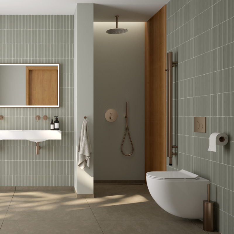 Wprowadza do wnętrza niepowtarzalne ciepło i nutę luksusu.Ten zmysłowy odcień doskonale przełamuje chłód płytek, tworząc zgrany duet z pastelami lub głębokimi, butelkowymi barwami dodatków.