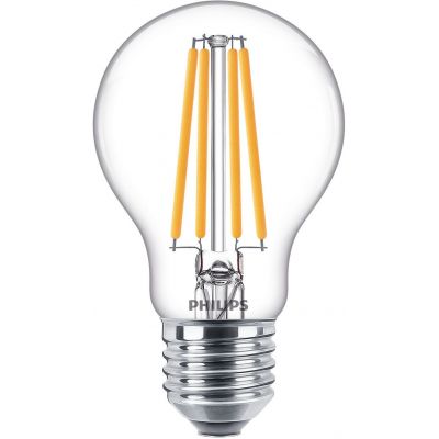 Żarówka LED marki PHILIPS 7W, do używania na co dzień w pomieszczeniach. Znajome kształty, które kochasz. Zużywają około 85% mniej energii niż tradycyjne żarówki dzięki najnowszej technologii energooszczędnej LED i mają dziesięć razy dłuższy okres użytkowania. Żarówka filamentowa standardowa z przezroczystego szkła, z gwintem E27, 15 000 godzin eksploatacji i strumień światła o wartości 806 lumenów. Moc lampy odpowiada światłu żarówki 60W.