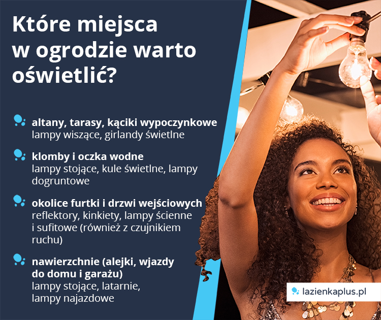 Oświetlenie ogrodowe spełnia wiele ważnych funkcji. Bez niego komfortowe i bezpieczne korzystanie z ogrodu po zapadnięciu zmroku nie byłoby możliwe. Podpowiadamy, jak wybrać lampy ogrodowe i gdzie je zamontować, by ogród był przyjazny użytkownikowi i atrakcyjny wizualnie; na co zwrócić uwagę przed zakupem oświetlenia do ogrodu, aby było bezpiecznie i jakie rozwiązania zastosować, by ograniczyć zużycie prądu i zmniejszyć wysokość rachunków.