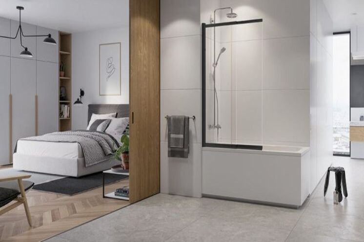 - Wahadłowe – działają podobnie, jak jednoskrzydłowe drzwi umieszczone na zawiasach. Mogą otwierać się zarówno w kierunku wanny, jak i w stronę łazienki, przez co zajmują sporo miejsca (a to sprawia, że nie nadają się do bardzo małych łazienek). Łatwo utrzymać je w czystości, ale nie chronią w pełni powierzchni przed rozbryzgami wody (ta może przepływać między zawiasami). Cała konstrukcja jest dość delikatna, dlatego nie montuje się tu zbyt dużych drzwi – dominują węższe i lżejsze modele. Alternatywą jest montaż podwójnych skrzydeł, z dwóch stron wanny, jednak takie rozwiązanie zajmuje dodatkowe miejsce.