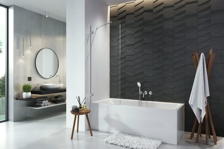 - Stałe – to najprostszy model osłony wannowej, który wygląda jak klasyczna ścianka prysznicowa. Pojedynczą szybę montuje się na stałe do ściany za pomocą profili lub delikatniejszych zawiasów. Taki parawan nie zajmuje dużo miejsca i jest łatwy w utrzymaniu czystości, ale pozostawia sporą część wanny bez osłony, dlatego nie chroni całej powierzchni przed zachlapaniem.