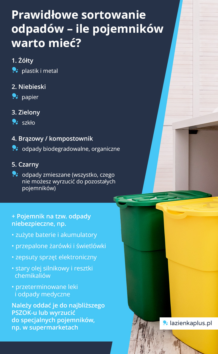 W każdej kuchni niezbędne będą również pojemniki na odpady, najlepiej takie, które umożliwiać będą ich sortowanie zgodne z obowiązującymi zasadami. Do wyboru mamy: