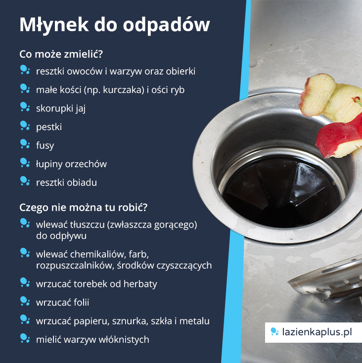 - młynki do odpadów – montuje się je pod zlewem. Zapobiegają nagromadzeniu się w odpływie resztek jedzenia, co może doprowadzić do zatkania lub powstawania nieprzyjemnych zapachów. Pomagają w utrzymaniu czystości na co dzień.