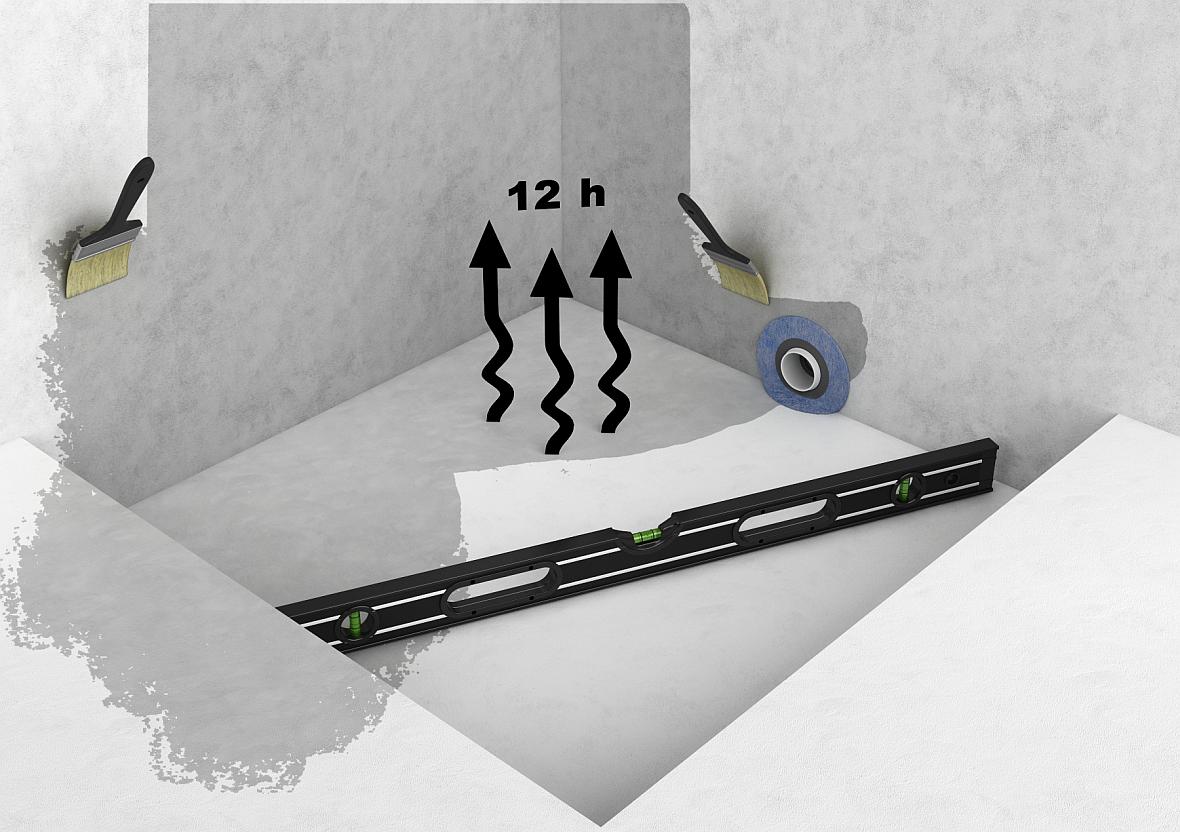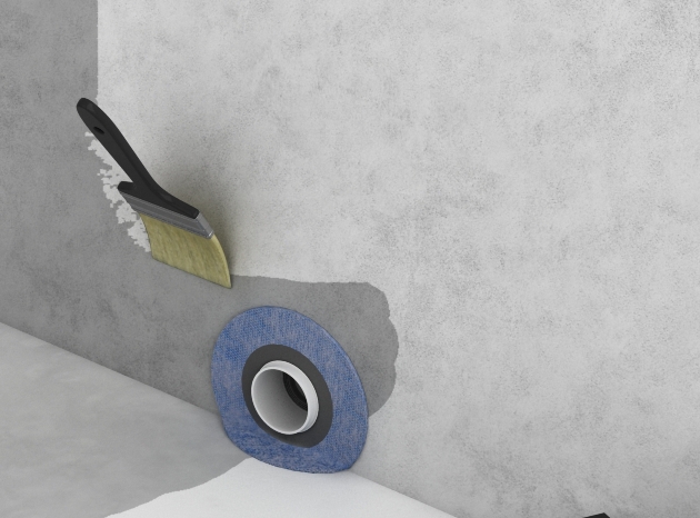 Następnie wykonujemy warstwę hydroizolacyjną (np. folią w płynie) nie tylko w miejscu wybrania, ale na całej powierzchni podłogi łazienki oraz na ścianach w strefie prysznica (na całej wysokości i 50 cm za bokami strefy prysznicowej). Szczególnie newralgiczne miejsca (jak np. narożniki, rura odpływowa) należy uszczelnić specjalną taśmą wodoszczelną lub odpowiednimi kołnierzami. Przed uszczelnieniem powinniśmy przygotować przewód łączący uziemienie budynku z metalową rynną odpływową.