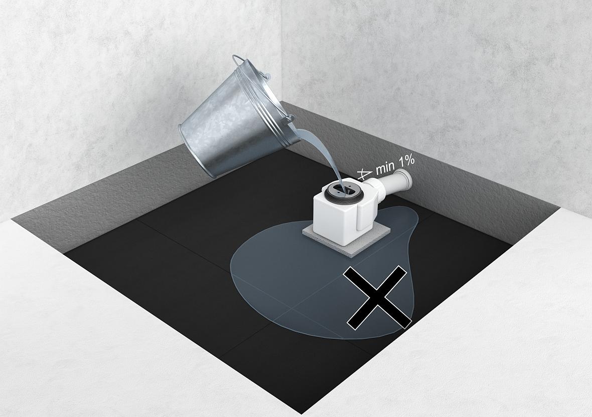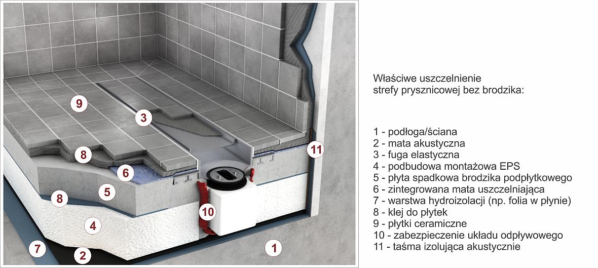 Dlatego warto wcześniej upewnić się o możliwości wykonania odpowiednio głębokiego obniżenia, najlepiej już na etapie budowy stropu czy układania warstw podłogowych na gruncie. Ostatecznie tego rodzaju obniżenie można przygotować także w dwóch poziomach – pod powierzchnią spadkową zagłębienie może wynosić około 6 cm, a w miejscu osadzenia syfonu i rur odpływowych pełną głębokość, czyli 12-15 cm. Wymogi te stają się szczególnie istotne w przypadku łazienek w mieszkaniach lub na wyższych kondygnacjach domów jednorodzinnych (na tzw. podłogach na konstrukcjach stropowych).