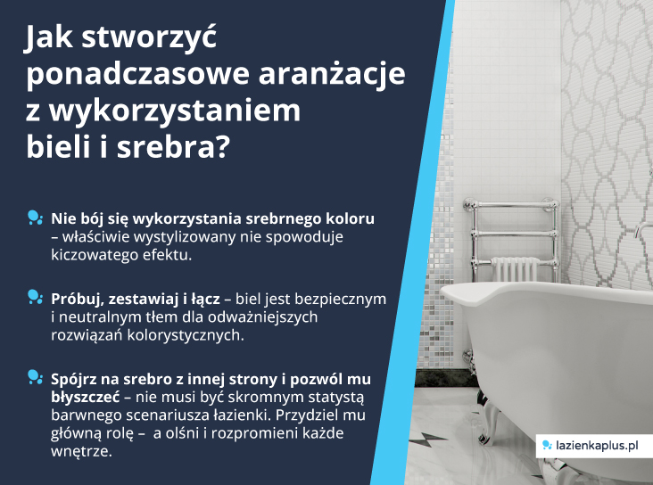 Ten charakterystyczny kolor świetnie sprawdzi się także w przypadku elementów wyposażenia białej łazienki. Srebrna wanna lub zabudowana połyskującą mozaiką, srebrne umywalki łazienkowe czy szafki łazienkowe z wykończeniem w tym odcieniu mogą stanowić centralny punkt pomieszczenia, wokół którego zbudujesz stylową aranżację. Ważne, aby nie bać się odważnych kolorów i – kierując się poradami i wskazówkami specjalistów, podpartymi wiedzą oraz doświadczeniem – szukać własnego stylu, unikając bezpiecznych, sztampowych rozwiązań.