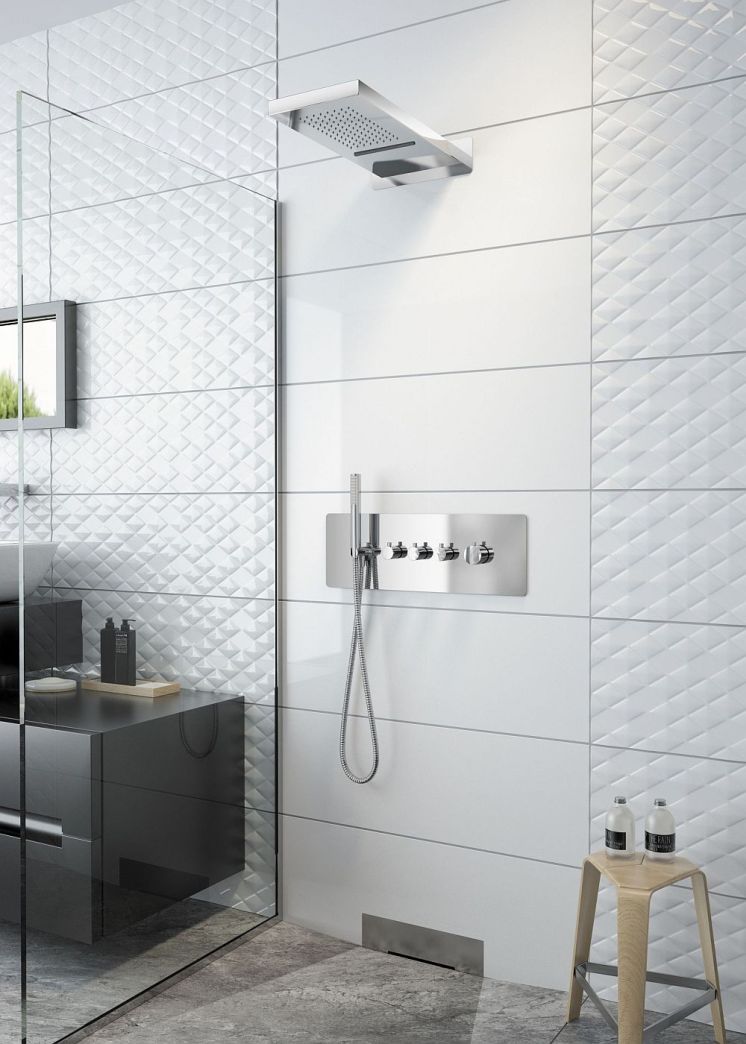 Srebro w wersji maxi można zastosować w łazience m.in. na ścianach w postaci np: