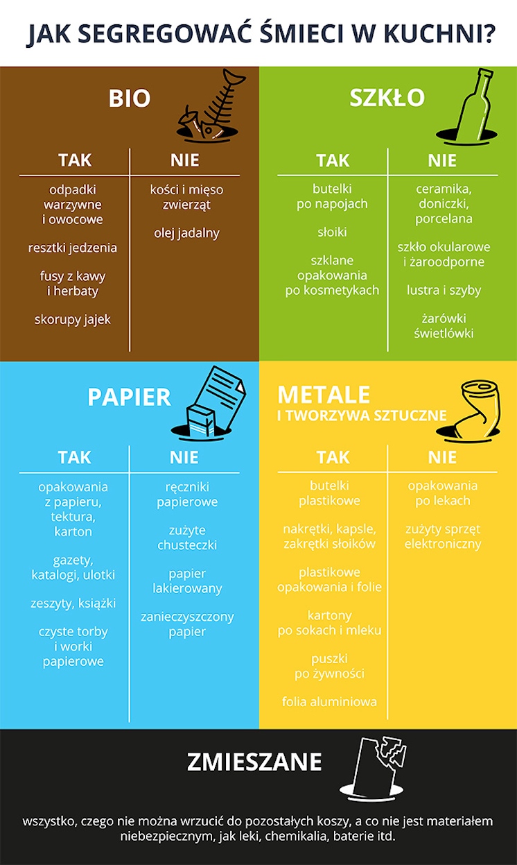 • i najważniejsze – nie zapominaj o właściwej segregacji śmieci – nie mieszaj odpadków, nawet jeśli wydaje ci się, że są tego samego rodzaju (np. brudnego papieru nie wrzucaj do pojemnika na papier, ale do śmieci zmieszanych, a kości zwierząt do odpadków bio – te również powinny się znaleźć w odpadkach zmieszanych)