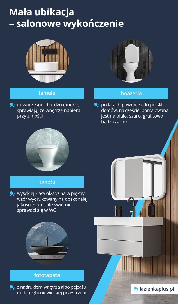Jednym z najczęstszych problemów jest brak miejsca na klasyczne rozwiązania – takie jak chociażby szafka na przechowywanie środków czystości czy papieru toaletowego, czy też umywalka. Dlatego często sięga się po miniatury czy elementy, które można podwiesić, np. szafki przysufitowe.