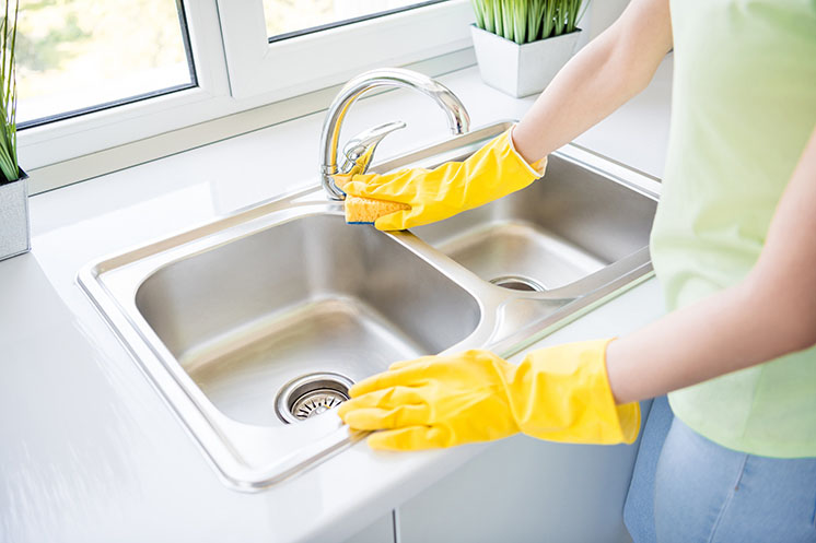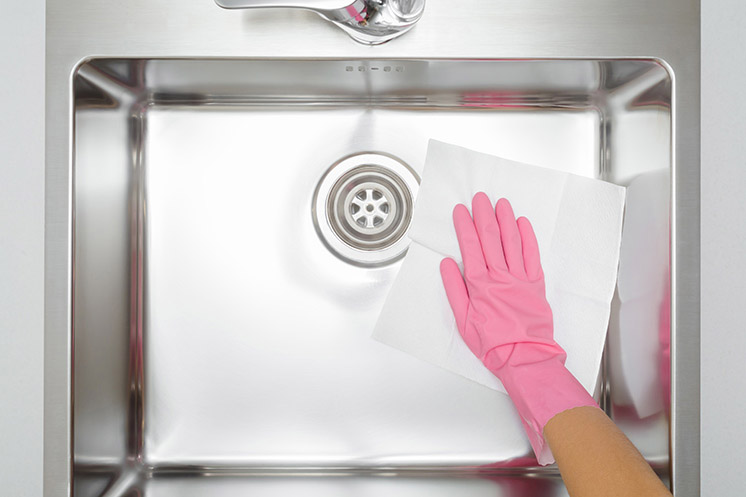 Regularne przecieranie powierzchni pozwala unikać trudnych w usuwaniu zabrudzeń i utrzymać zlew w dobrej kondycji. Użycie zwykłego płynu do mycia naczyń jest wystarczające do regularnego czyszczenia i konserwacji połysku zlewu stalowego.