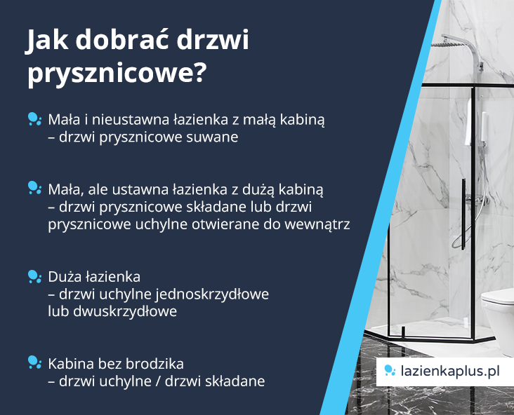 W małej łazience najlepiej sprawdzają się drzwi przesuwne, które nie wymagają dodatkowego miejsca przy otwieraniu i są najwygodniejsze. Alternatywą dla nich są drzwi prysznicowe składane, które jednak nie zawsze zmieszczą się w nieustawnym pomieszczeniu. Należy zwrócić uwagę, że przy składaniu będą wystawać poza kabinę, ewentualnie zmniejszać przestrzeń samej kabiny, co przy niewielkiej strefie kąpielowej może być niewygodne. Można też zdecydować się na drzwi uchylne do wewnątrz. Jednak wychodzenie spod takiego prysznica może być utrudnione, zwłaszcza jeśli otwarte skrzydło zajmie większą część kabiny.