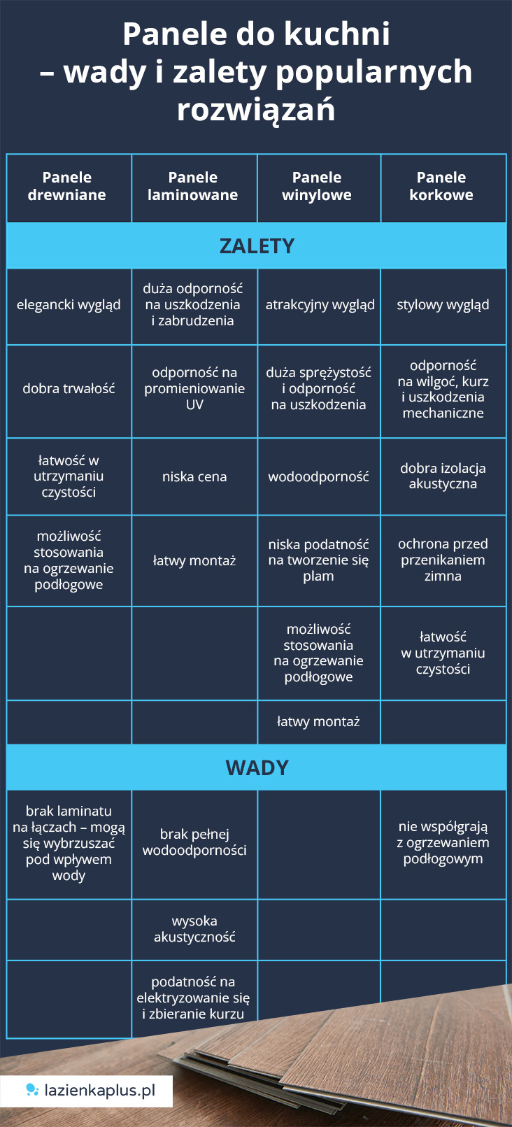 Panele laminowane do kuchni mają jednak swoje wady. Przede wszystkim mają wysoką akustyczność. Przypadkowe upuszczenie przedmiotów generuje tu dość duży hałas. Poza tym łatwo się elektryzują, przez co szybciej zbierają kurz. Co prawda można ograniczyć ten problem, stosując odpowiednie preparaty czyszczące, ale wymaga to już jakiegoś wysiłku.