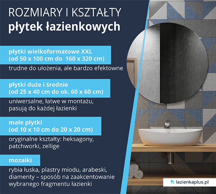 Uniwersalnym rozwiązaniem są za to klasyczne płytki prostokątne o standardowej wielkości (np. 20x60 cm, 40x40 cm czy 60x60 cm). Ich montaż nie jest skomplikowany i pasują do niemal każdej łazienki.