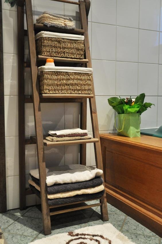 Na takiej drabinie świetnie prezentują się poskładane ręczniki, mydła i różnego rodzaju kosmetyki czy koszyki łazienkowe. Tego rodzaju ozdoba spełni nie tylko praktyczną funkcję półki, ale będzie również stanowiła efektowny i niecodzienny element Twojej łazienki, zwłaszcza jeśli ta zaaranżowana została w stylu rustykalnym.