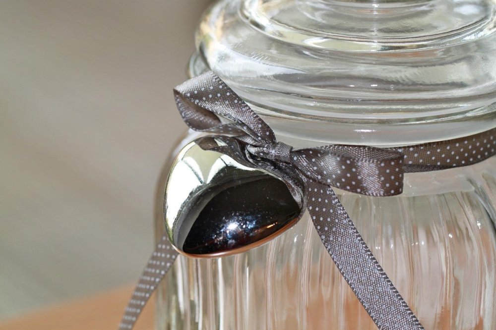 A jeśli nie masz w domu absolutnie żadnych szklanych pojemników, które możesz wykorzystać, to użyj słoików – znajdziesz ich z pewnością całkiem sporo w swoich kuchennych szafkach. Wystarczy kolorowa wstążka i już masz oryginalny pojemnik na patyczki do uszu lub płatki kosmetyczne.