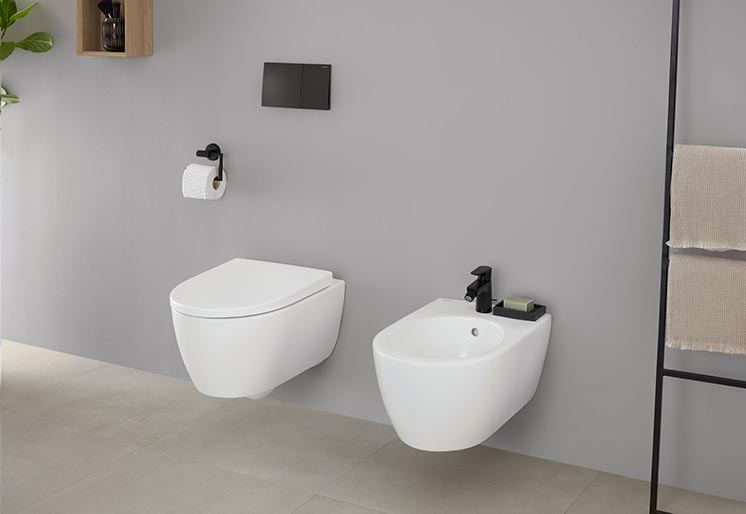 Ten wiszący model jest łatwy w montażu dzięki wspornikowi dystansowemu EFF3. Zamknięta forma i ukryte mocowania dają spójny wygląd. Do tego modelu dostępna jest też wolnoopadająca deska Geberit.