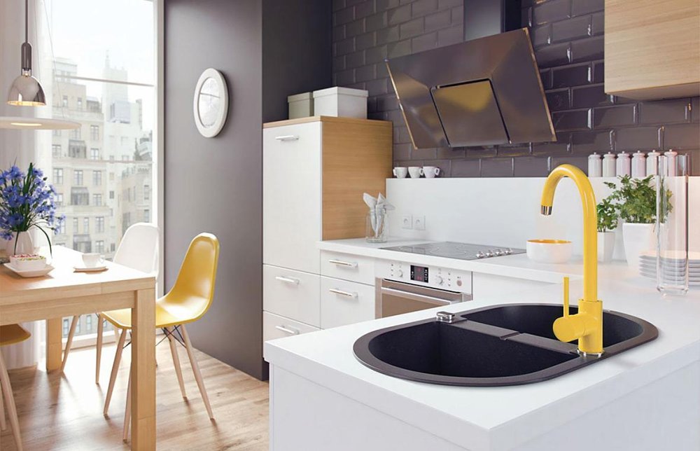 Wspólnie biesiadowanie to jedna z największych korzyści posiadania połączonej dużej kuchni z jadalnią. Otwarta przestrzeń i łatwa komunikacja osób znajdujących się w kuchni i w jadalni tylko to ułatwiają. Zadbajmy jednak, aby projektując pomieszczenia, dyskretnie ukryć pewne elementy wyposażenia. Barek pomiędzy dwiema strefami i odpowiednia aranżacja wyspy to klucze do sukcesu. Sprytną opcją jest montaż spójnego kolorystycznie wyposażenia, by nic „nie rzucało się” w oczy, np. zlewozmywaków granitowych w kolorze blatów.