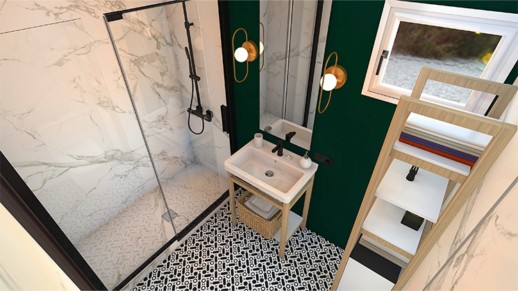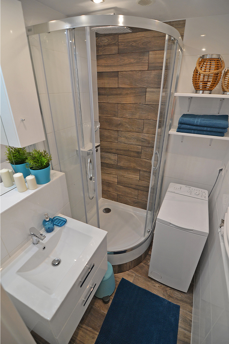 Kluczowym punktem aranżacji jest podział łazienki na strefy – z WC, umywalką, prysznicem lub wanną i – o ile to konieczne – z pralką i suszarką. Jeśli możesz umieścić sprzęty AGD w innym pomieszczeniu, wykorzystaj to. Dzięki temu zaoszczędzisz sporo miejsca, a łazienka zyska na przestronności.