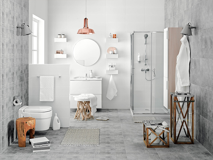 Druga kwestia dotyczy stylu. Biel i szarości są doskonałą bazą do wielu różnych stylizacji. Występując w duecie, świetnie sprawdzają się na przykład w stylu minimalistycznym. Wystarczy uzupełnić je o dyskretne zestawy podtynkowe, eleganckie meble i sanitaria o geometrycznej formie i aranżacja gotowa. Dobrze odnajdują się też w oszczędnym, praktycznym stylu skandynawskim, wzbogacone o kilka elementów z naturalnego drewna. W surowym wydaniu realizują zasady stylu industrialnego, a uzupełnione o błyszczące elementy ze złota, srebra czy kryształów, świetnie wpisują się w stylizacje glamour.