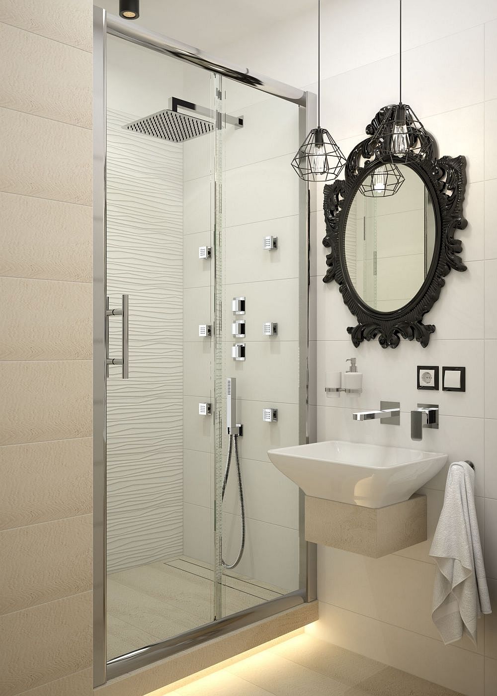 Ciekawą opcją są też płytki z brokatem, które dodatkowo rozświetlają wnętrze. W dużych łazienkach i pokojach kąpielowych warto nieco „pobawić się” układem płytek, uzupełniając je o połyskujące i przyciągające wzrok elementy wyposażenia.