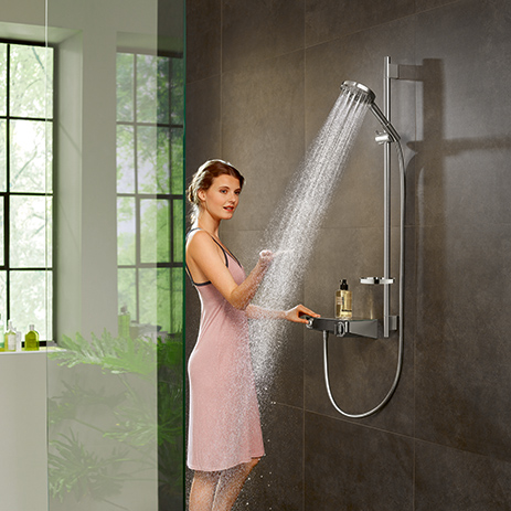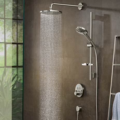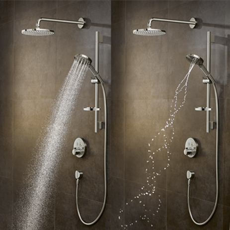 Strumień mikrokropli zasila produkty prysznicowe Raindance Select S. W zależności od naszych potrzeb oraz możliwości łazienki możemy dowolnie dobierać zestawy prysznicowe.