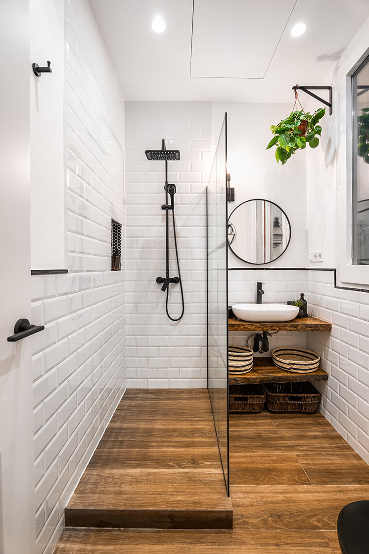 - kompozycja wnętrza, np. układ fug czy rozmieszczenie płytek o różnych fakturach (baterię najlepiej montować na gładkich płytkach).