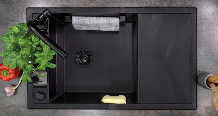 Funkcjonalność nie kończy się tutaj - zintegrowany syfon Space-saver ułatwia m.in. segregację śmieci, co sprawia, że kuchnia jest nie tylko miejscem gotowania, ale również oazą czystości i porządku. Syfon jest barwiony w masie, przez co jest dużo odporniejszy na uszkodzenia, a jego uniwersalny kolor czarny mat ułatwia dobranie dowolnego wykończenia baterii.