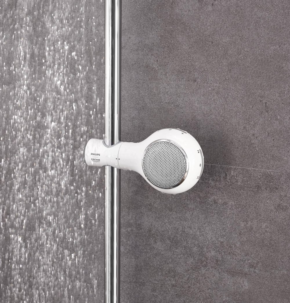 Wśród wielu użytkowników nowoczesnej łazienki, znajdą się również tacy, którzy nie lubią rozstawać się z muzyką nawet podczas kąpieli, a nie chcą lub nie mogą zamontować wodoodpornego systemu nagłaśniającego zintegrowanego z kabiną prysznicową. Z myślą o takich osobach, niektóre firmy opracowały specjalne głośniki przeznaczone do użycia w łazience, dzięki którym odprężymy się po ciężkim dniu wyzwań w rytmie ulubionych dźwięków! Firma GROHE jako jedyny producent z branży sanitarnej stworzył głośnik Aquatunes, który posiada specjalny uchwyt umożliwiający zamocowanie go na drążku prysznicowym.