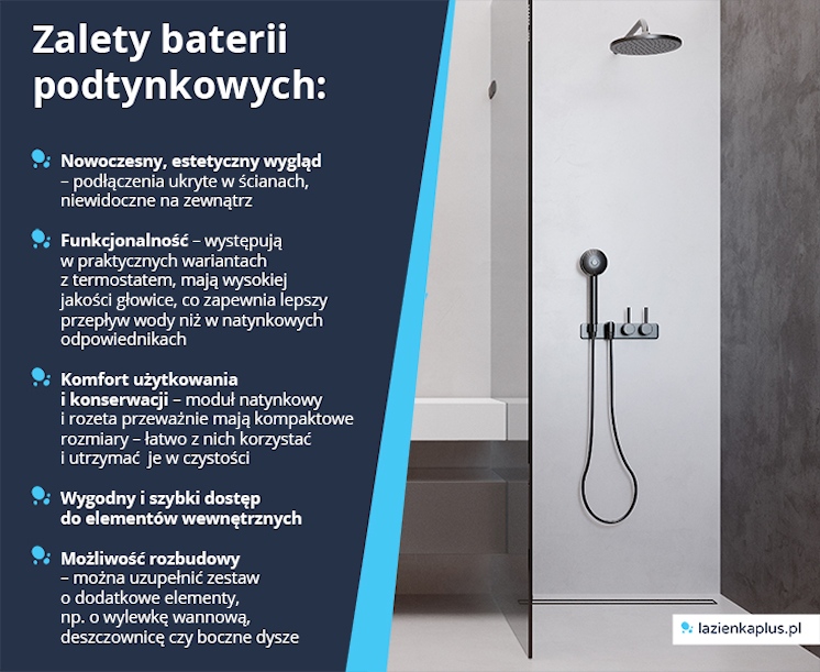 Następnie wybieramy model baterii podtynkowych wedle naszych potrzeb i upodobań spośród tych z termostatem lub bez. Te pierwsze zapewniają większą wygodę użytkowania i zapobiegają poparzeniom podczas kąpieli. Termostat blokuje pokrętło regulacyjne powyżej określonej temperatury, zapewniając użytkownikowi przyjemną, ciepłą wodę do kąpieli. Dodatkowo oszczędzamy wodę, nie tracąc czasu na jej podgrzanie. Baterie termostatyczne są droższe od tradycyjnych, ale warte uwagi.