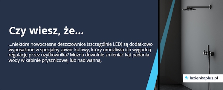 Jeżeli decydujemy się na montaż sufitowy, musimy umieścić deszczownicę ponad centralnym punktem kabiny prysznicowej. Średnica przyłączy sufitowych jest przeważnie standardowa i wynosi 15 mm.