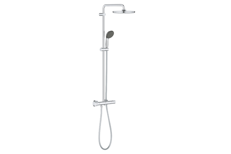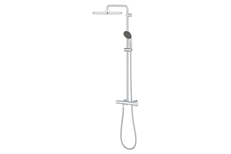 2. Grohe Vitalio Start 250 zestaw prysznicowy termostatyczny z deszczownicą chrom - zestaw wyposażono w funkcjonalny ogranicznik przepływu, który umożliwia zaoszczędzenie aż do 9,5l wody na minutę. Sercem systemu prysznicowego Grohe Vitalio Start 250 jest bateria termostatyczna, która wyrównuje wahania ciśnienia i utrzymuje wybraną temperaturę wody. Ogromną zaletą zestawu jest także deszczownica. Duża, okrągła wyposażona została w technologię Grohe DreamSpray i oferuje równy, miękki strumień wody. Silikonowe dysze natrysku umożliwiają łatwe usunięcie osadzającego się kamienia.