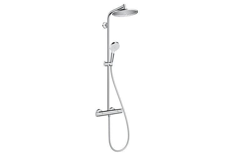 4. Hansgrohe Crometta S Showerpipe zestaw prysznicowy ścienny termostatyczny chrom - atrakcyjny wygląd i wysoka jakość to cechy charakterystyczne dla tego zestawu. Wyróżnia się ponadczasowym nowoczesnym wzornictwem. Duża okrągła deszczownica zapewnia przyjemną i relaksującą kąpiel. Zestaw wyposażony został w baterię termostatyczną z blokadą maksymalnej temperatury, dzięki czemu użytkownik uniknie ewentualnych poparzeń.