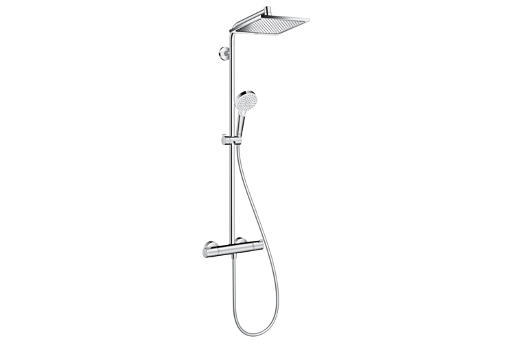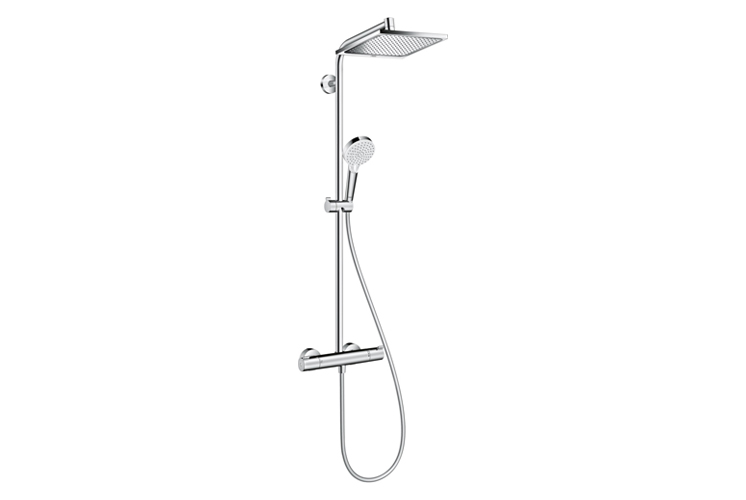 3. Hansgrohe Crometta E Showerpipe EcoSmart zestaw prysznicowy ścienny termostatyczny chrom - ten elegancki, chromowany, natynkowy zestaw prysznicowy z kwadratową deszczownicą spodoba się każdemu, komu zależy na wygodzie i komforcie użytkowania prysznica. Dzięki systemowi EcoSmart, który ogranicza przepływ wody jej zużycie będzie mniejsze. Duża tarcza prysznicowa - XXL Performance zapewni relaksującą i komfortową kąpiel, a bateria termostatyczna pozwoli cieszyć się stałą temperaturą wody. Czyszczenie tego zestawu prysznicowego również nie sprawi problemów, dzięki systemowi QuickClean.