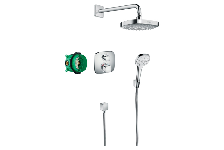 10. Hansgrohe Croma Select E zestaw prysznicowy podtynkowy termostatyczny chrom - zestaw podtynkowy z deszczownicą Croma Select E 180 2jet i funkcjonalną baterią termostatyczną Ecostat E z zaworem odcinająco-przełączającym zagwarantuje komfortową kąpiel. Designerskie wzornictwo i ponadczasowe chromowane wykończenie idealnie sprawdzą się w łazience w każdym stylu.