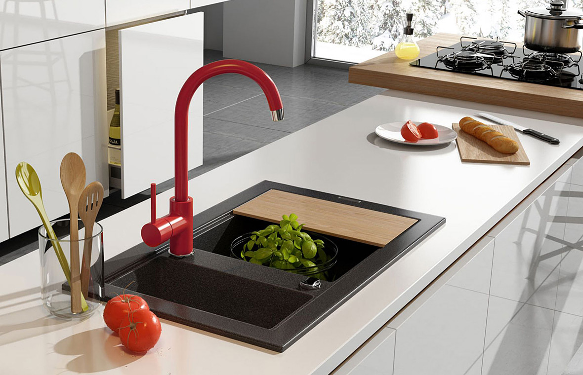 Warto zwrócić uwagę na baterie w wykończeniu granitowym. Ich powłoka jest niezwykle trwała i odporna na zarysowania, a kolor idealnie dopasowany do zlewów kompozytowych – świetnie sprawdzą się w kuchni o dużej intensywności użytkowania.