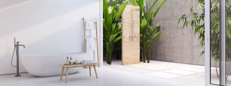 - Obecność zieleni redukuje stres i wspiera relaks, a to wzmacnia kojący efekt kąpieli.