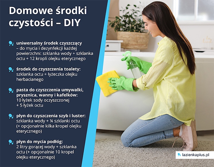 Do mycia łazienki możesz użyć gotowych produktów dostępnych w sklepach albo równie skutecznych, a zdecydowanie mniej szkodliwych dla zdrowia mieszanek domowej roboty, na bazie octu, sody oczyszczonej czy kwasku cytrynowego. Dla zneutralizowania ostrych zapachów, wystarczy wzbogacić mieszankę o kilka kropli ulubionych olejków eterycznych.