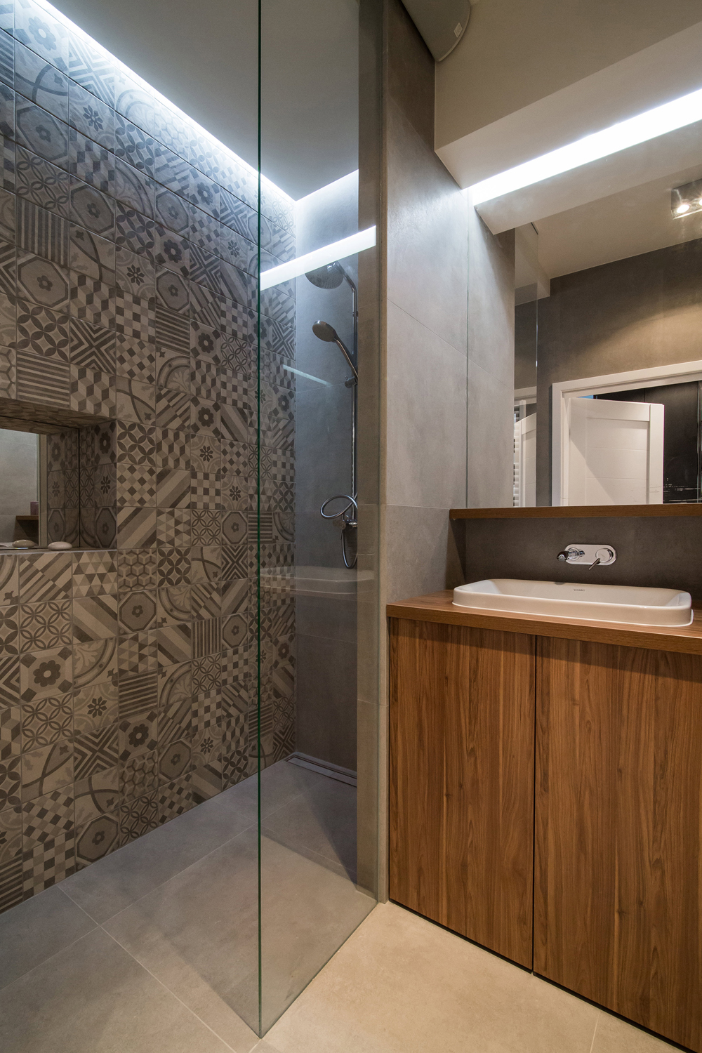 MP: Łazienka w bloku wbrew temu, co się na ogół myśli, wcale nie musi być ciasna lub nieustawna. Wszystko jest kwestią przemyślenia, zaaranżowania, a także zwrócenia uwagi na to, co konstrukcja budynku nam umożliwia bądź nie. Z pewnością należy uważać, by nie przeładować takiego pomieszczenia – im mniej, tym lepiej.