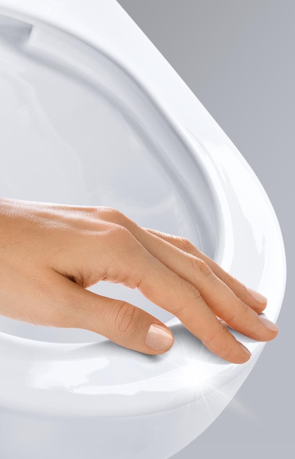 Hydrofilowa warstwa AquaCeramic zabezpiecza przed przywieraniem brudu do misy, a powłoka HyperClean wykorzystuje aktywne jony srebra, by uniemożliwić rozwój bakterii i drobnoustrojów. Dodatkowo, trzy wyjścia wody tworzą silny wir spłukujący, który perfekcyjnie opłukuje misę z każdego, choćby najdrobniejszego, zanieczyszczenia. Taki samym poziomem sterylnej czystości odznaczają się dysze natryskowe, wykonane z materiału o poświadczonej przez SIAA(Towarzystwo Technologii i Artykułów Antybakteryjnych) 99,9% antybakteryjności.