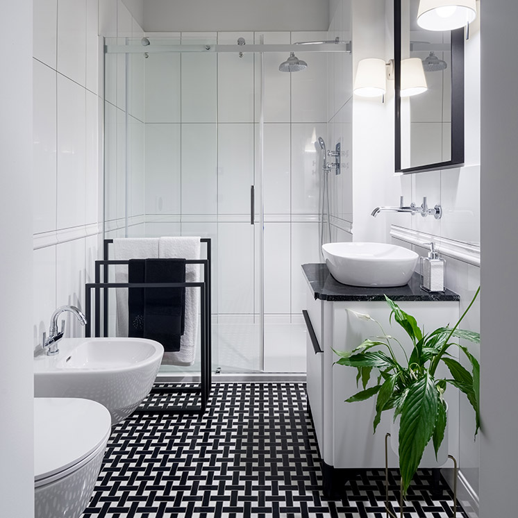- RACJONALNIE: na podłodze połóż płytki imitujące drewno, na ścianach białe; sięgnij po ceramikę o minimalistycznych, ale łagodnych formach; zastosuj we wnętrzu czarne akcenty, np. w postaci baterii i akcesoriów.